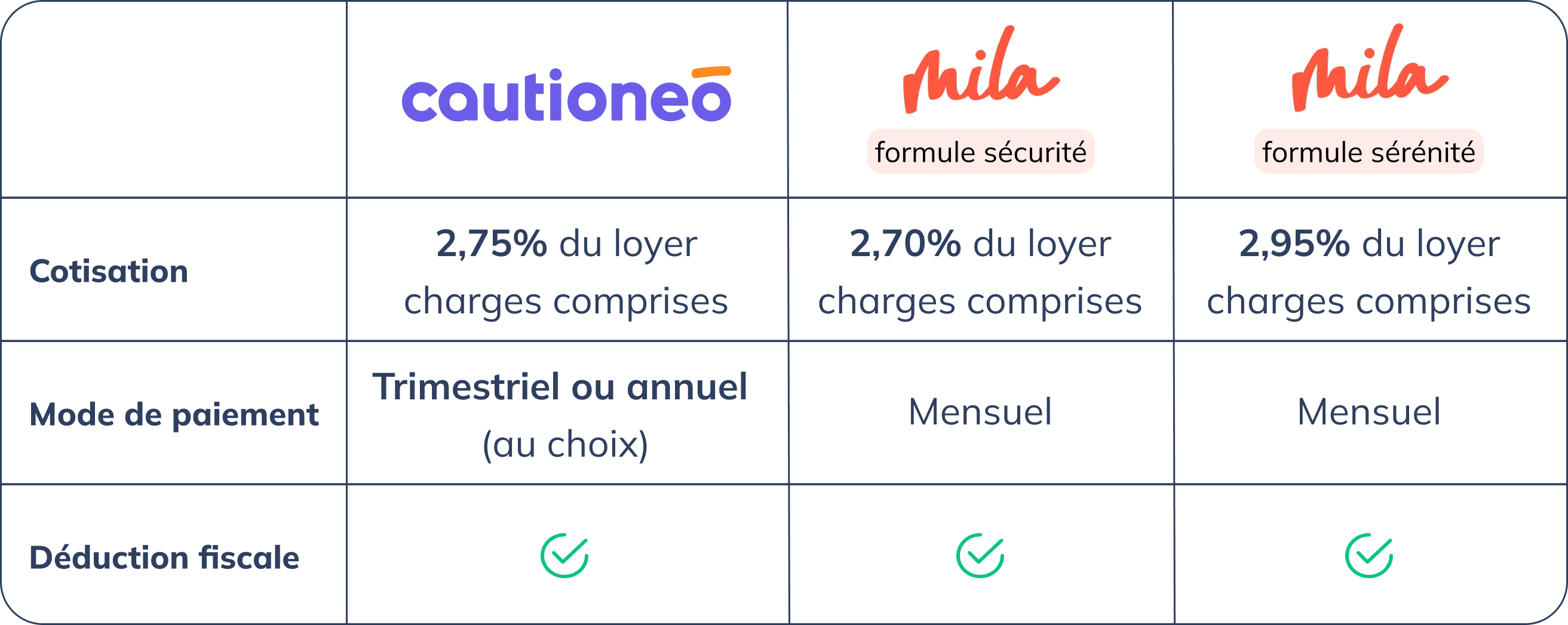 Depuis la dernière augmentation tarifaire de Mila, leur formule "Sérénité" – censée offrir un niveau de garantie équivalent à celui de Cautioneo – dépasse désormais 3,85 % du loyer charges comprises dans certains départements (93 et 95), et atteint 2,95 % à 3,15 % dans le reste de la France.